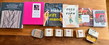 The non yarn items we bought: Knitted Cable Sourcebook by Norah Gaughn, Neons and Neutrals by Aimee Gille, Make, Thrift, Mend by Katrina Rodabaugh, Yoga of Yarn by Liza Laird, the MDK field guide Brioche featuring Nancy Marchant, some chicken cards, some goat's milk soap from Cat's View Farm and a card case for our Bootie and Bossy cards!